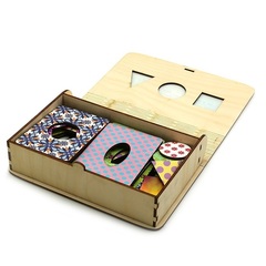 - Сенсорный комодик. Маленький фанерный комодик с выдвижными ящичками и разноцветными пуговками для сортировки. В наборе есть рамки-вкладыши для логических заданий.